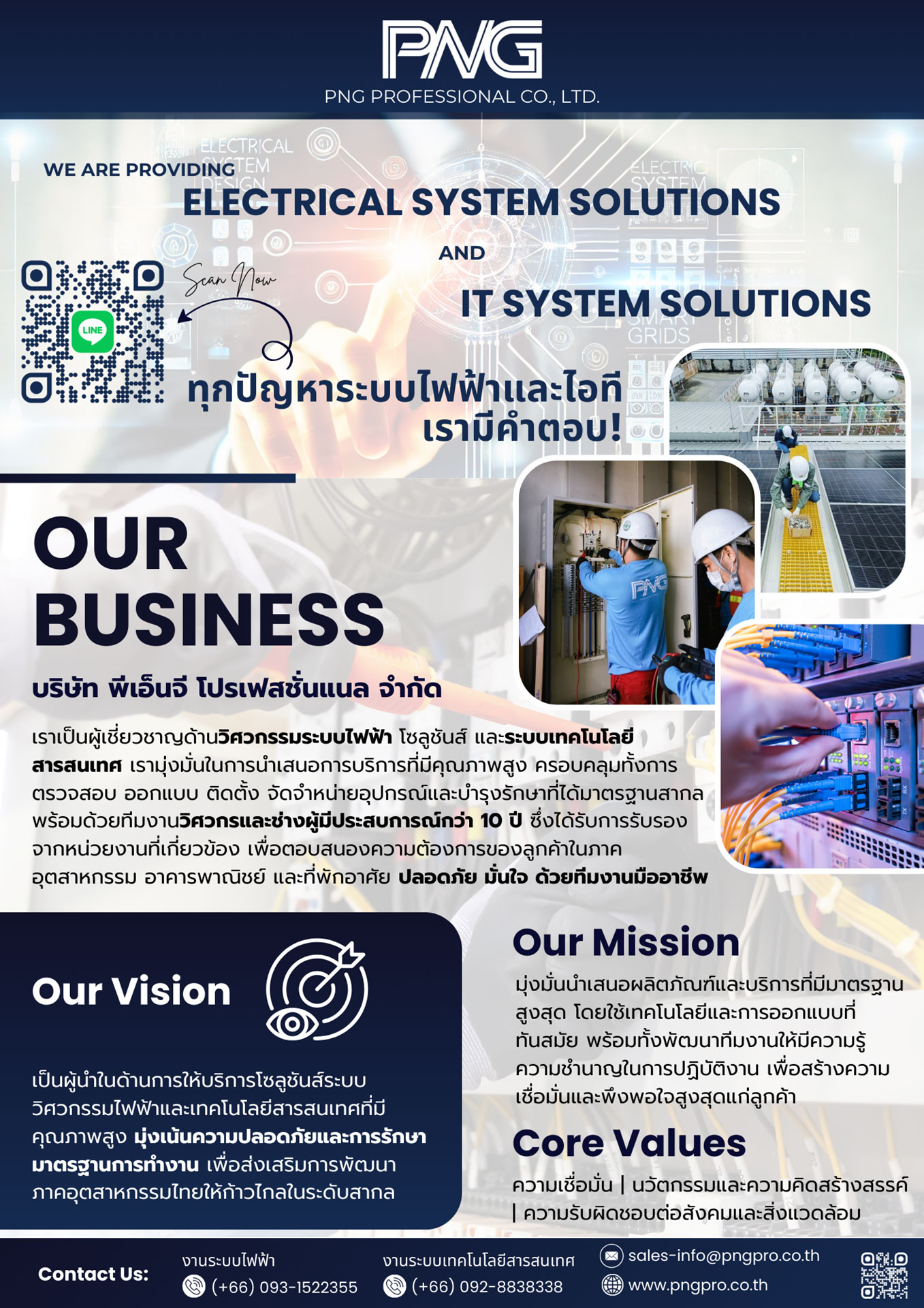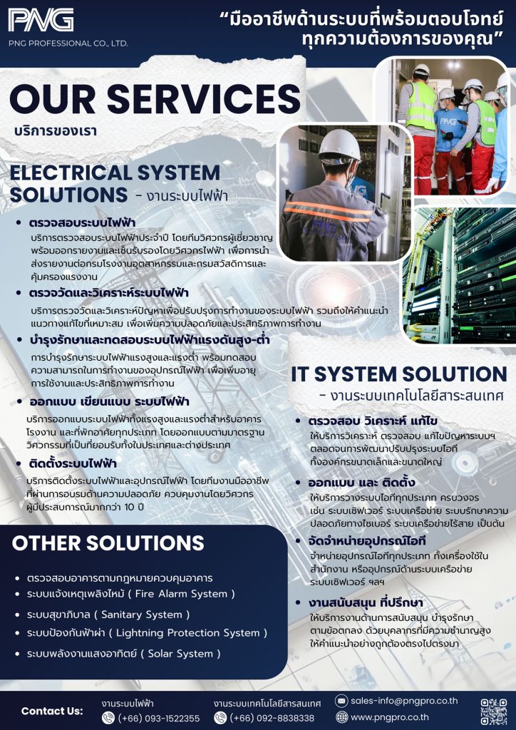 บริษัท พีเอ็นจี โปรเฟสชั่นแนล จำกัด ให้ บริการงานระบบไฟฟ้า บ้าน ไฟฟ้าโรงงาน สำนักงาน รวมถึงโครงสร้างอาคารต่างๆ งานระบบไอที ระบบเครือข่าย ( Networks ) Wi-Fi ระบบเซิฟเวอร์ ( Servers ) ออกแบบ วิเคราะห์ ตรวจสอบระบบคอมพิวเตอร์อย่างครบวงจร ด้วยทีมงานวิศวกรที่มีประสบการณ์มากกว่า 10